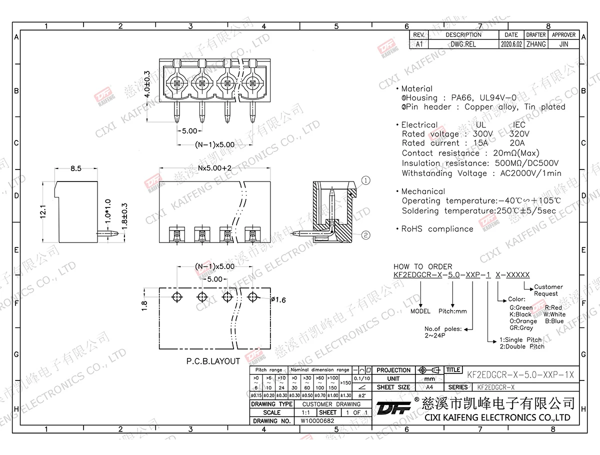 MATERIAL:contact: -Pin header: Brass, Tin platedHousing: PA66,UL94V-0ElectricalULIECRated voltage300V 320V Rated current15A20AContact resistance20mΩInsulation resistance500MΩ/DC500VWithstanding voltage AC2000V/1minWire range-MechanicalTemp.rang-40℃~+105℃ Max.soldering+250℃,5secTorque-Strip length-