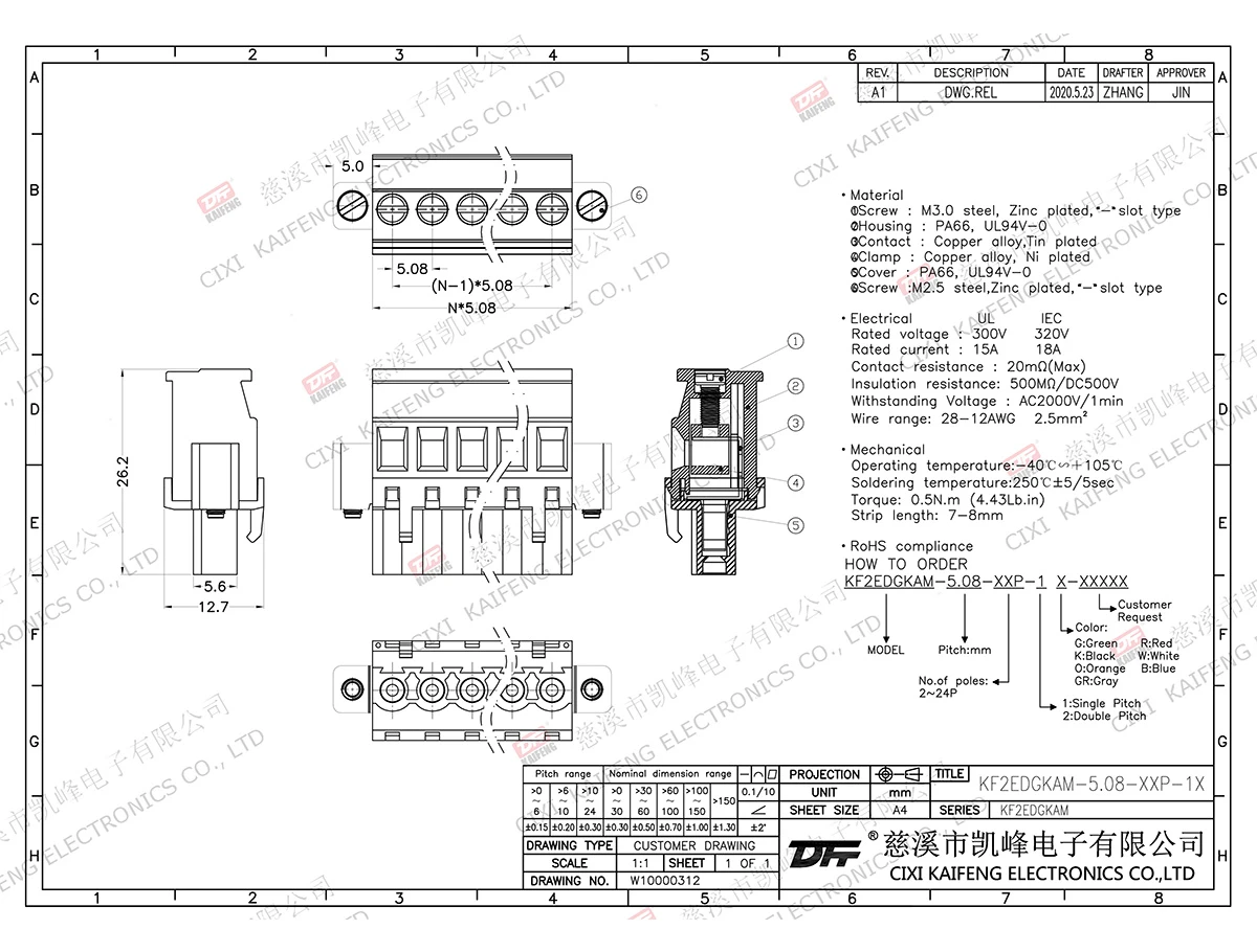Pluggable Terminal Block MATERIAL:M2.5,Steel Zinc platedcontact: Phosphor bronzePin header: -Housing: PA66,UL94V-0ElectricalULIECRated voltage300V 320V Rated current15A10AContact resistance20mΩInsulation resistance500MΩ/DC500VWithstanding voltage AC2000V/1minWire range28-12AWG 2.5mm²MechanicalTemp.rang-40℃~+105℃ Max.soldering+250℃, 5s