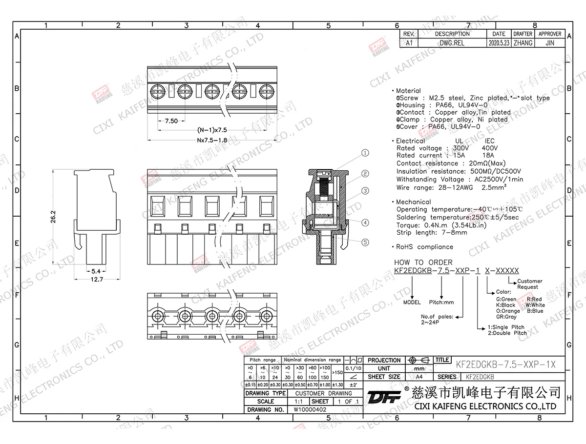 Pluggable Terminal Block MATERIAL: M2.5,Steel Zinc platedcontact: Phosphor bronzePin header: -Housing: PA66,UL94V-0ElectricalULIECRated voltage300V 400V Rated current15A10AContact resistance20mΩInsulation resistance500MΩ/DC500VWithstanding voltage AC2500V/1minWire range28-12AWG 2.5mm²MechanicalTemp.rang-40℃~+150℃ Max.soldering+250℃, 5s