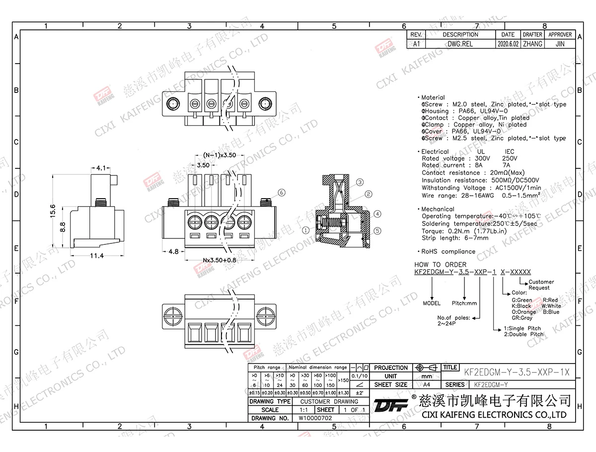 Pluggable Terminal Block MATERIAL:M2.0,Steel Zinc platedcontact: Phosphor bronzePin header: -Housing: PA66,UL94V-0ElectricalULIECRated voltage300V 250V Rated current8A7AContact resistance20mΩInsulation resistance500MΩ/DC500VWithstanding voltage AC1500V/1minWire range28-16AWG 0.5-1.5mm²MechanicalTemp.rang-40℃~+150℃ Max.soldering+250℃,