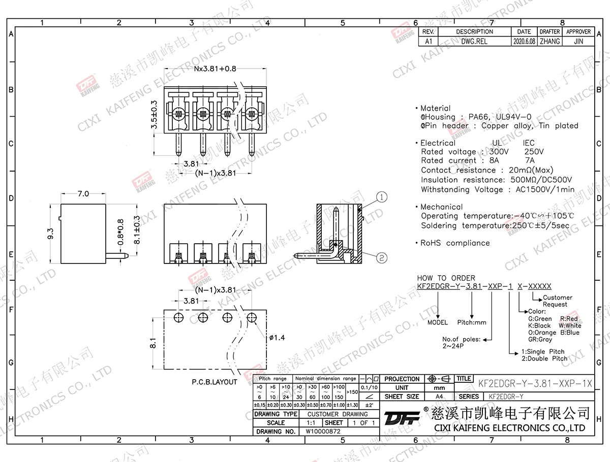 Pluggable Terminal Block MATERIAL:MATERIALScrews: -contact: -Pin header: Brass, Tin platedHousing: PA66,UL94V-0ElectricalULIECRated voltage300V 250V Rated current8A7AContact resistance20mΩInsulation resistance500MΩ/DC500VWithstanding voltage AC1500V/1minWire range-MechanicalTemp.rang-40℃~+105℃ Max.soldering+250℃,5secTorque-Strip length-