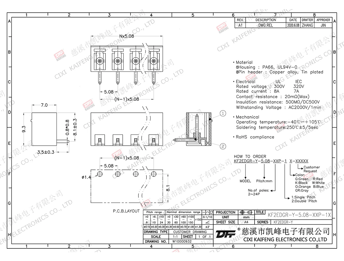 Pluggable Terminal Block MATERIAL:contact: -Pin header: Brass, Tin platedHousing: PA66,UL94V-0ElectricalULIECRated voltage300V 320V Rated current8A7AContact resistance20mΩInsulation resistance500MΩ/DC500VWithstanding voltage AC2000V/1minWire range-MechanicalTemp.rang-40℃~+105℃ Max.soldering+250℃,5secTorque-Strip length-