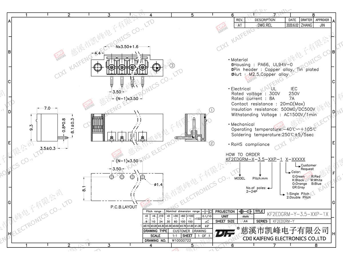 Pluggable Terminal Block MATERIAL:contact: -Pin header: Brass, Tin platedHousing: PA66,UL94V-0ElectricalULIECRated voltage300V 250V Rated current8A7AContact resistance20mΩInsulation resistance500MΩ/DC500VWithstanding voltage AC1500V/1minWire range-MechanicalTemp.rang-40℃~+105℃ Max.soldering+250℃,5secTorque-Strip length-