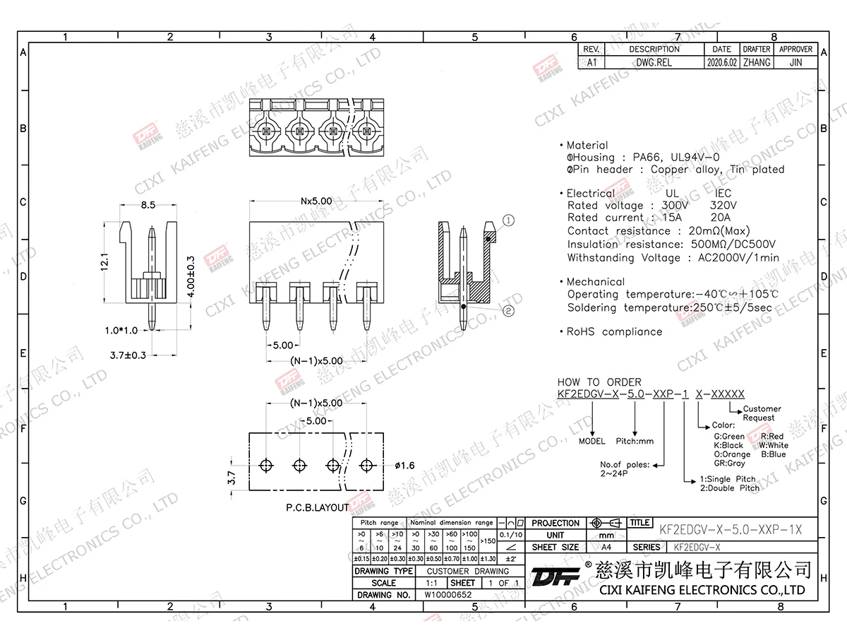 Pluggable Terminal Block MATERIAL:contact: -Pin header: Brass, Tin platedHousing: PA66,UL94V-0ElectricalULIECRated voltage300V 320V Rated current15A20AContact resistance20mΩInsulation resistance500MΩ/DC500VWithstanding voltage AC2000V/1minWire range-MechanicalTemp.rang-40℃~+105℃ Max.soldering+250℃,5secTorque-Strip length-
