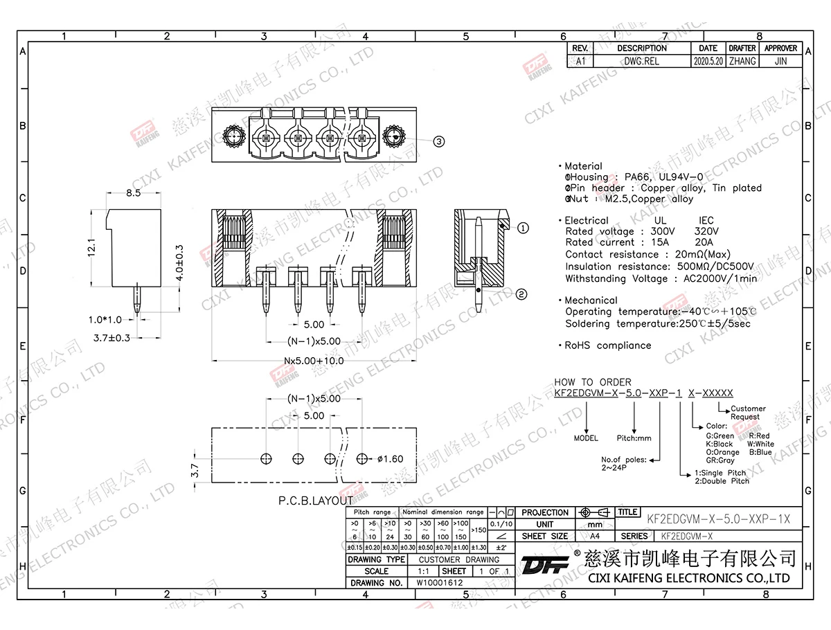 MATERIAL:MATERIALScrews: -contact: -Pin header: Brass, Tin platedHousing: PA66,UL94V-0ElectricalULIECRated voltage300V 320V Rated current15A20AContact resistance20mΩInsulation resistance500MΩ/DC500VWithstanding voltage AC2000V/1minWire range-MechanicalTemp.rang-40℃~+105℃ Max.soldering+250℃, 5secTorque-Strip length-