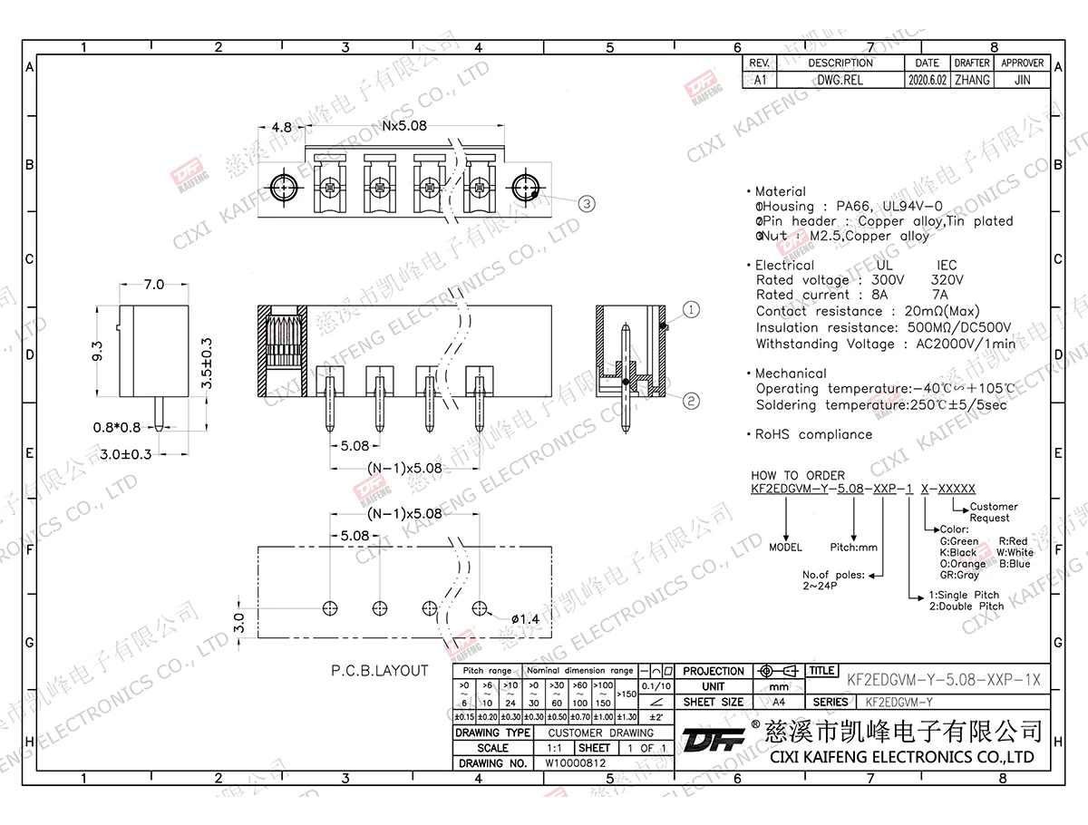 MATERIAL:MATERIALScrews: -contact: -Pin header: Brass, Tin platedHousing: PA66,UL94V-0ElectricalULIECRated voltage300V 320V Rated current8A7AContact resistance20mΩInsulation resistance500MΩ/DC500VWithstanding voltage AC2000V/1minWire range-MechanicalTemp.rang-40℃~+105℃ Max.soldering+250℃,5secTorque-Strip length-