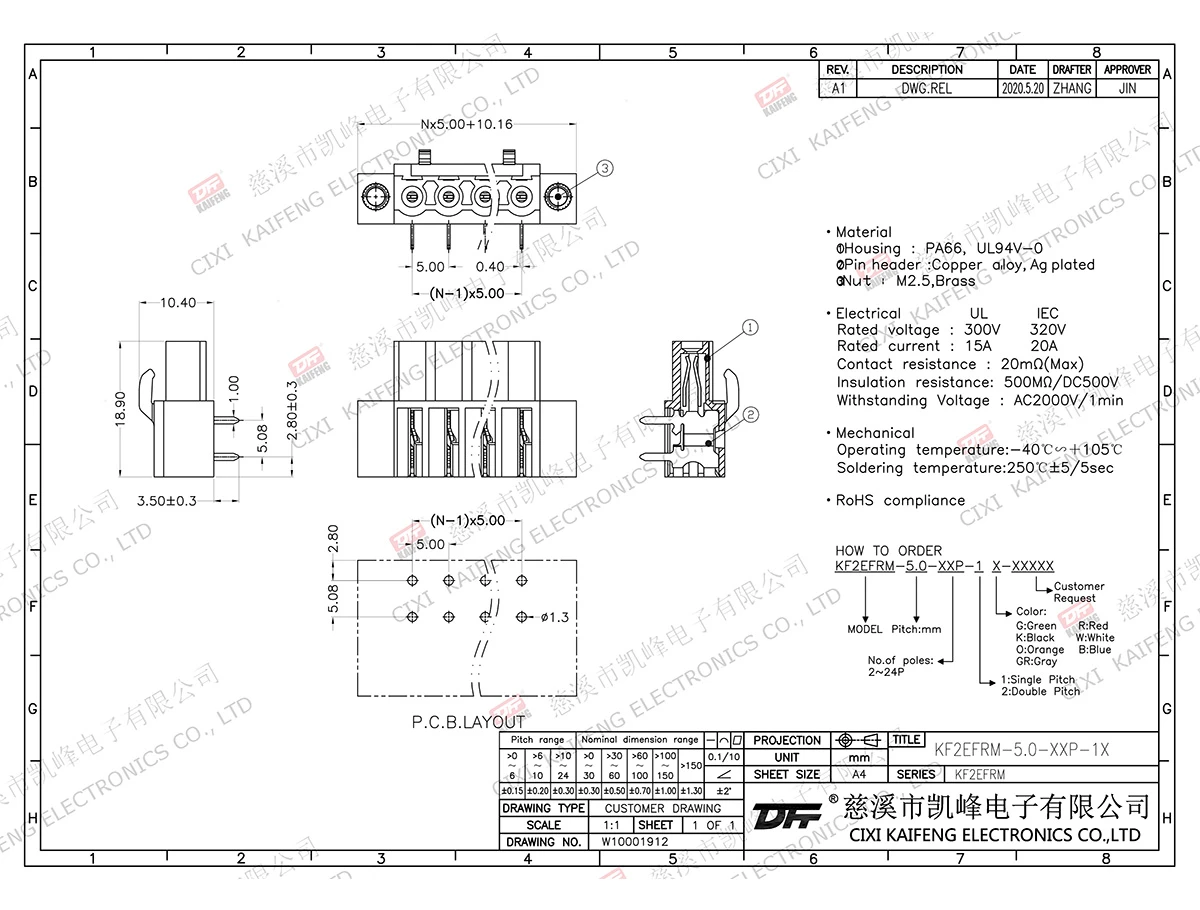 Pluggable Terminal Block MATERIAL:MATERIALClip: Phosphor bronze,Tinningcontact: -Reed: Stainless steelHousing: PA66,UL94V-0ElectricalULIECRated voltage300V 320V Rated current10A20AContact resistance20mΩInsulation resistance500MΩ/DC500VWithstanding voltage AC2000V/1minWire range26-12AWG 2.5mm²MechanicalTemp.rang-40℃~+105℃ Max.soldering+250℃, 5secTorque