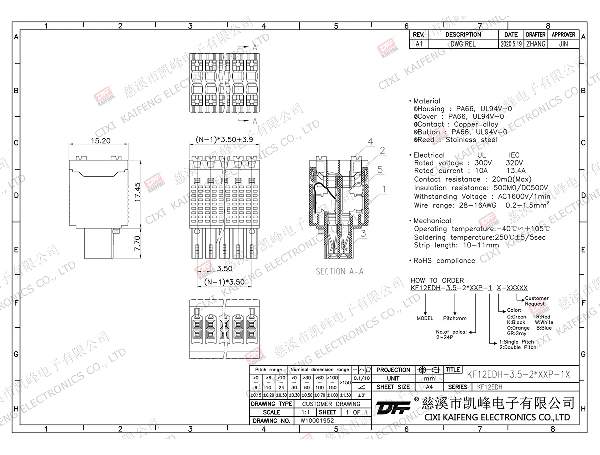 MATERIAL:PA66,UL94V-0Cover:PA66,UL94V-0Clip:Phosphor bronzeButton:PA66,UL94V-0Reed:Stainless steelElectricalULIECRated voltage300V 320V Rated current10A13.4AContact resistance20mΩ(Max)Insulation resistance500MΩ/DC500VWithstanding voltage AC1600V/1minWire range28-16AWG 0.2-1.5mm²MechanicalTemp.rang-40℃~+105℃&n