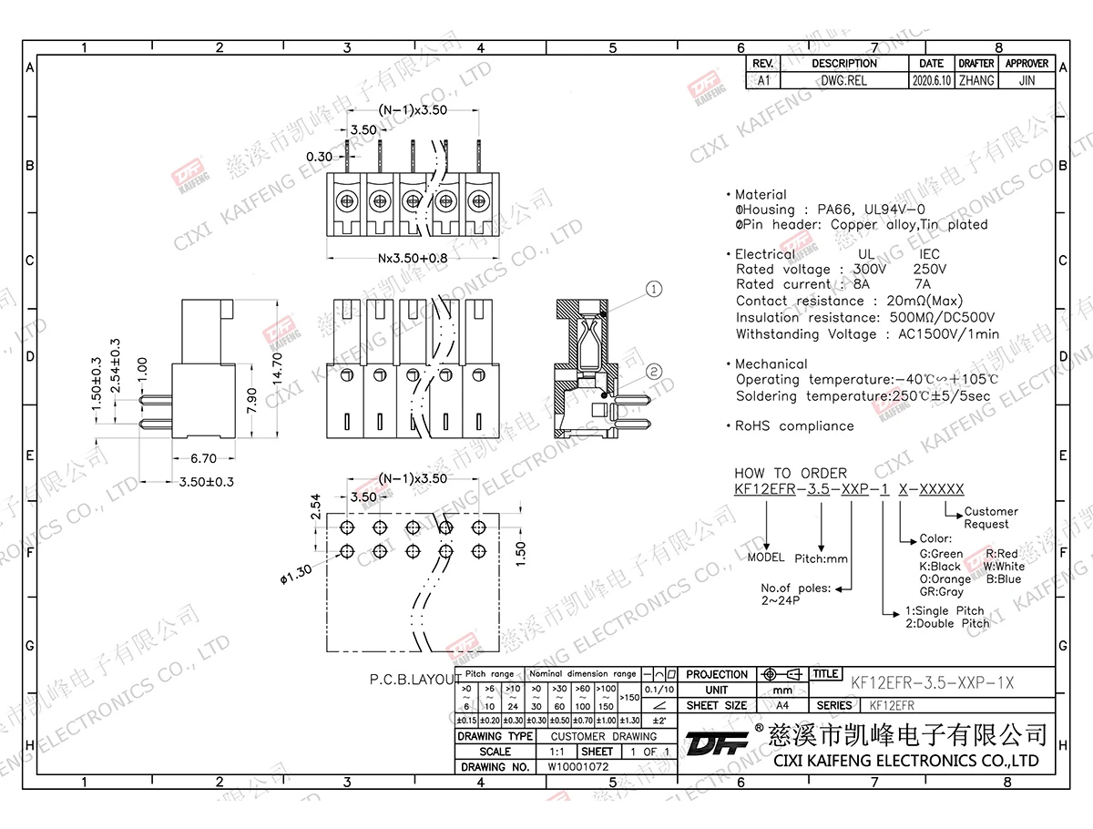 MATERIAL:contact: -Pin header: Phosphor bronze,TinningHousing: PA66,UL94V-0ElectricalULIECRated voltage300V 250V Rated current8A7AContact resistance20mΩInsulation resistance500MΩ/DC500VWithstanding voltage AC1500V/1minWire range-MechanicalTemp.rang-40℃~+105℃ Max.soldering+250℃, 5secTorque-Strip length-