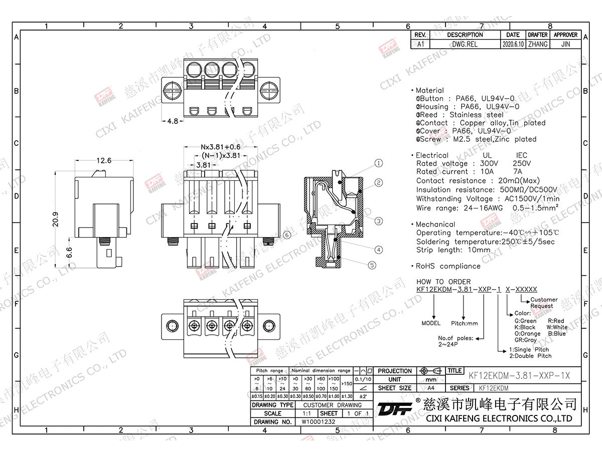 Pluggable Terminal Block MATERIAL:-contact: Phosphor bronzePin header: -Housing: PA66,UL94V-0ElectricalULIECRated voltage300V 250V Rated current10A7AContact resistance20mΩInsulation resistance500MΩ/DC500VWithstanding voltage AC1500V/1minWire range24-16AWG 0.5-1.5mm²MechanicalTemp.rang-40℃~+105℃ Max.soldering+250℃, 5secTorque-