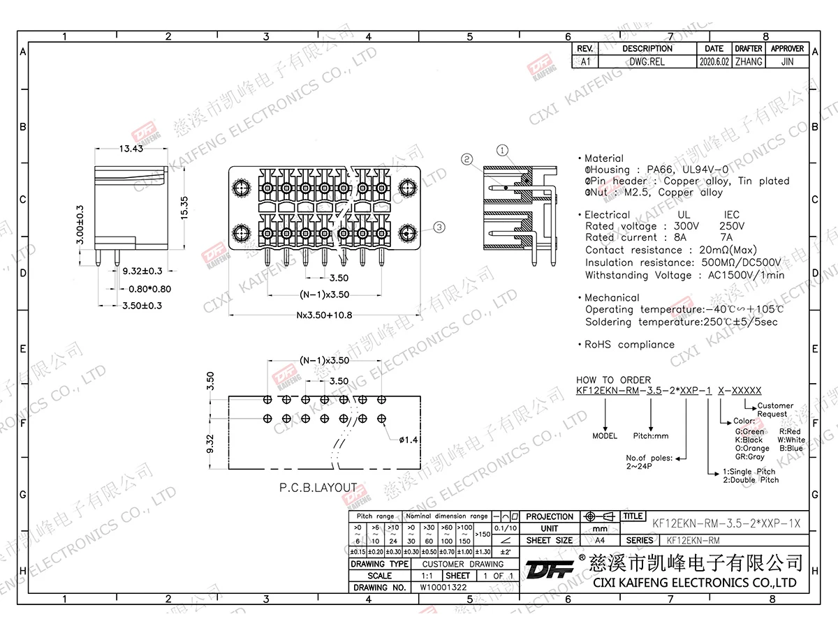 Pluggable Terminal Block MATERIAL:contact: -Pin header: Brass, Tin platedHousing: PA66,UL94V-0ElectricalULIECRated voltage300V 250V Rated current8A7AContact resistance20mΩInsulation resistance500MΩ/DC500VWithstanding voltage AC2000V/1minWire range-MechanicalTemp.rang-40℃~+105℃ Max.soldering+250℃, 5secTorque-Strip length-