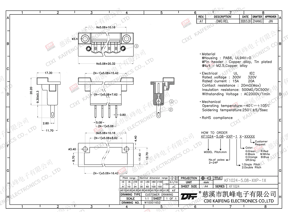 Pluggable Terminal Block MATERIAL:MATERIALScrews: -contact: -Pin header: Brass, Tin platedHousing: PA66,UL94V-0ElectricalULIECRated voltage300V 320V Rated current15A20AContact resistance20mΩInsulation resistance500MΩ/DC500VWithstanding voltage AC2000V/1minWire range-MechanicalTemp.rang-40℃~+105℃ Max.soldering+250℃, 5secTorque-Strip length-