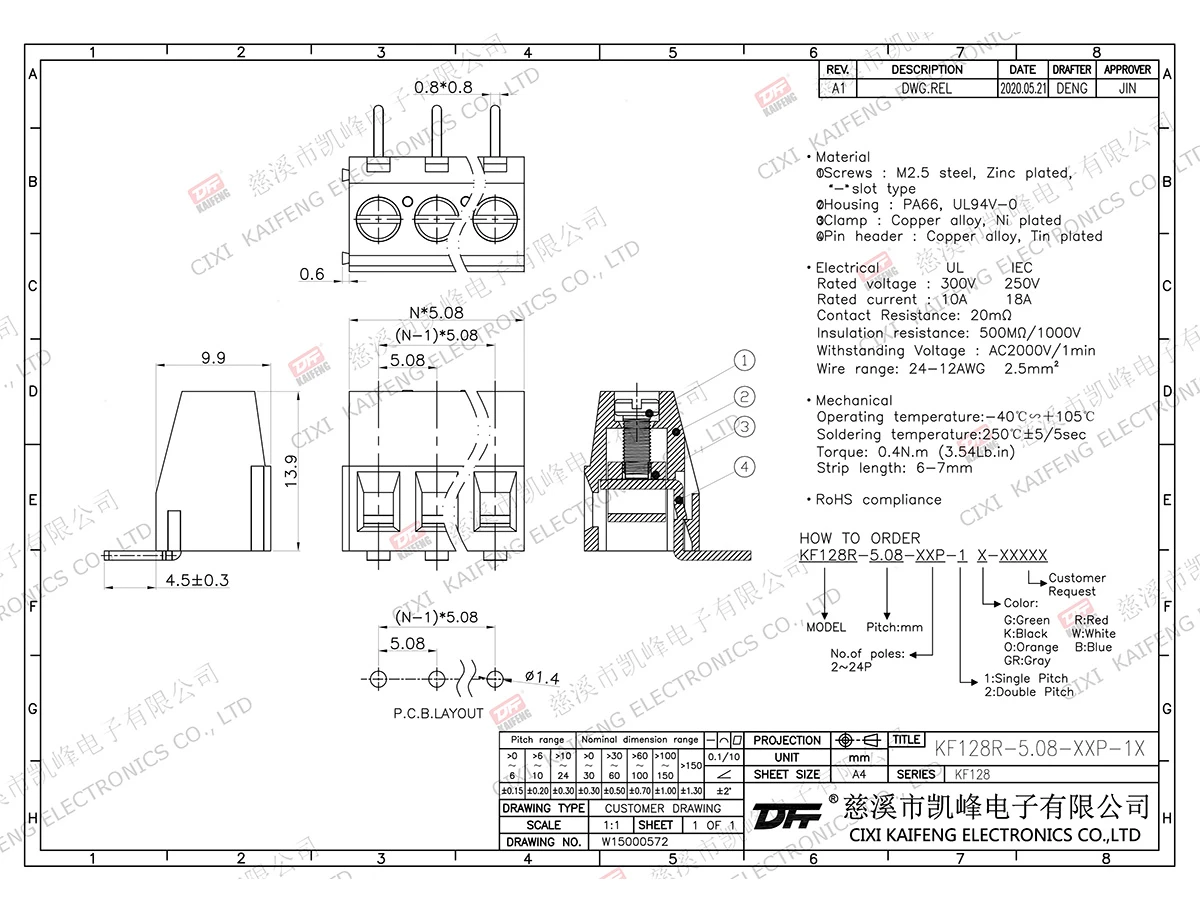 PCB Terminal Block MATERIAL:Screws:M2.5,Steel Zinc platedcontact:Brass, Tin platedPin header:Brass, Tin platedHousing:PA66,UL94V-0·ELECTRICALRated voltage:300VRated current:10AContact resistance:20mΩInsulation resistance:5000MΩ/1000VWithstanding voltage :AC1500V/1MinWire range:24-12AWG2.5mm²·MechanicalTemp.rang:-40℃~+105℃Max.soldering:+250℃,5 secondsTorque:0.4Nm(3.6lb.in)Strip length:6-7mm