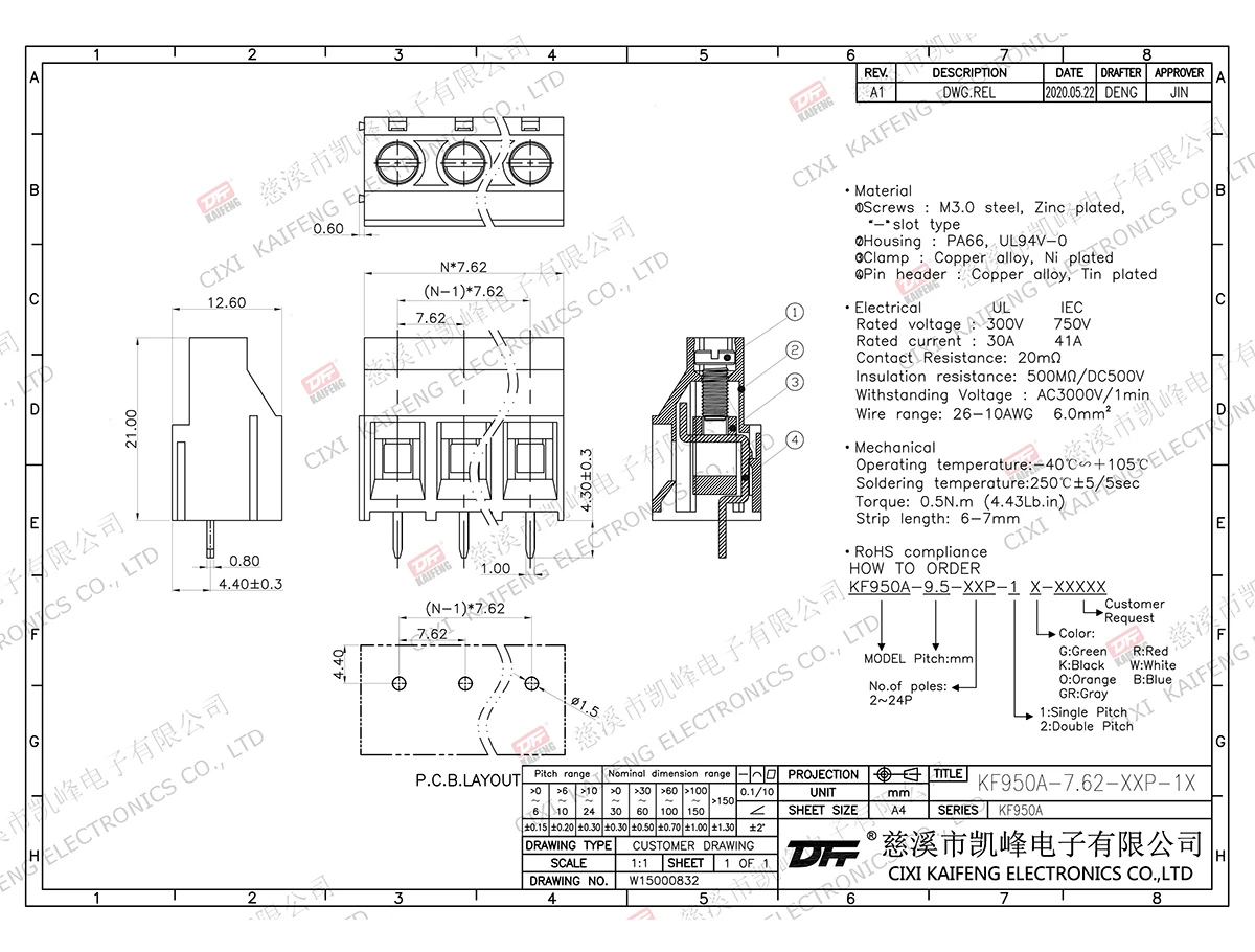 PCB Terminal Block MATERIAL:Screws:steel,M3Tin platedblock:Brass, Tin platedTerminal:Brass, Tin platedHousing:PA66UL94V-0ELECTRICALRated voltage:300VRated current:30AContact resistance:20mΩDielectric strength:5000MΩ/1000VWithstanding voltage :AC1500V/1MinApplicable wire diameter:26~10AWG4mm2MechanicalService temperature:-40℃~+105℃Max.soldering:+250℃for5SecTorque:0.5Nm(4.5lb.in)Strip length:6-7mm