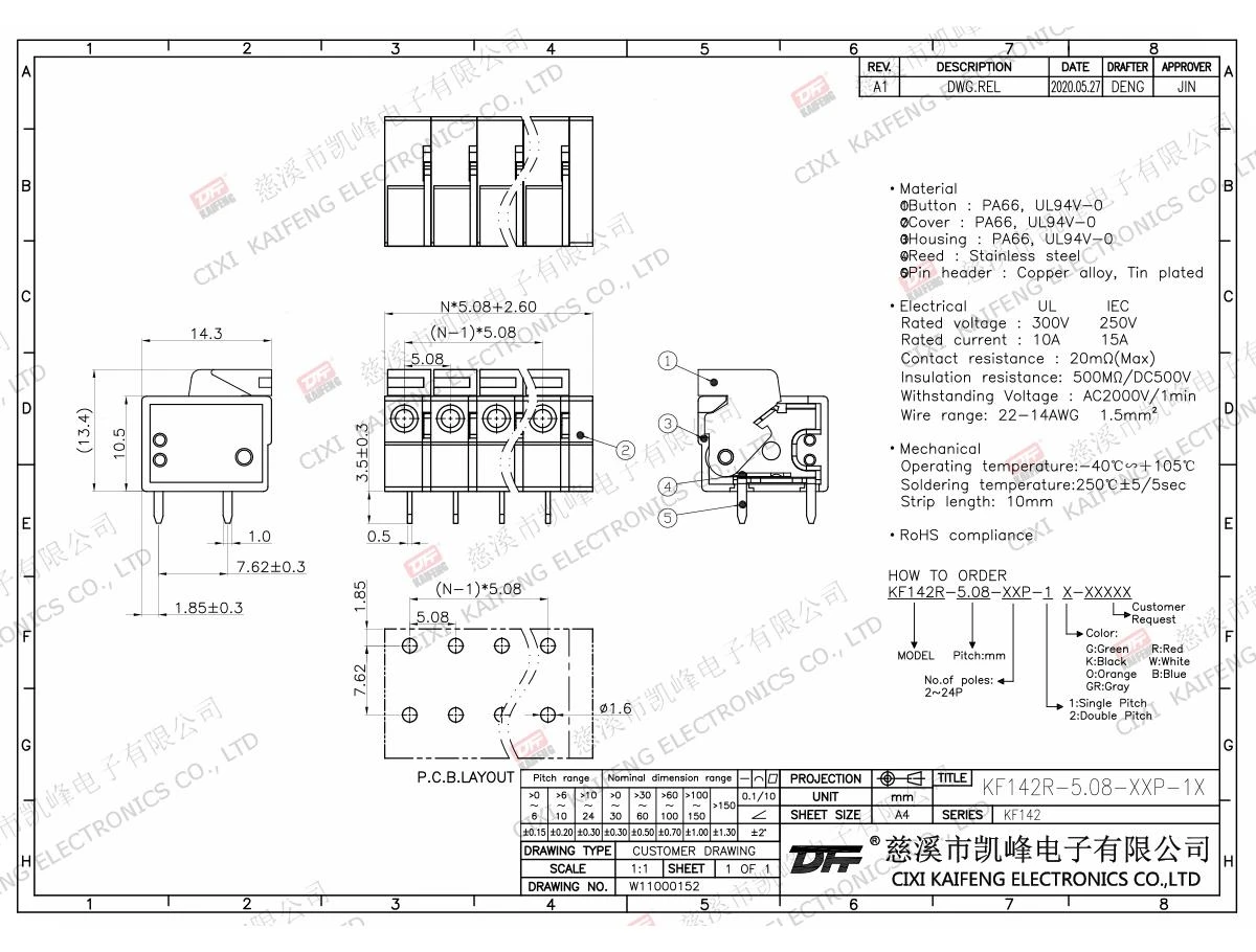 Material:①Button:PA66,UL94V-0②Cover:PA66,UL94V-0③Button:PA66,UL94V-0④Reed:Stainless steel⑤Pin header:Brass,Tin platedElectricalULIECRated voltage300V 250V Rated current10A15AContact resistance20mΩInsulation resistance500MΩ/DC500VWithstanding voltage AC2000V/1minWire range22-14AWG 1.5mm²MechanlicalTemp.rang-40℃~+105℃ Max.soldering+250℃,5sec