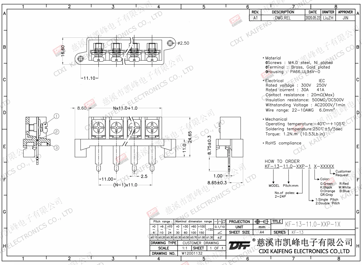 Material:M4.0 Steel,Ni platedTerminal:Brass,1.0t Ni platedHousing: PA66,UL94V-0ElectricalULIECRated voltage300V 250V Rated current30A41AInsulation resistance500MΩ/DC500VWithstanding voltage AC2000V/1minWire range22-10AWG 6.0mm²MechanlicalTemp.rang-40℃~+105℃ Torque1.2N.m 10.53Lb.in