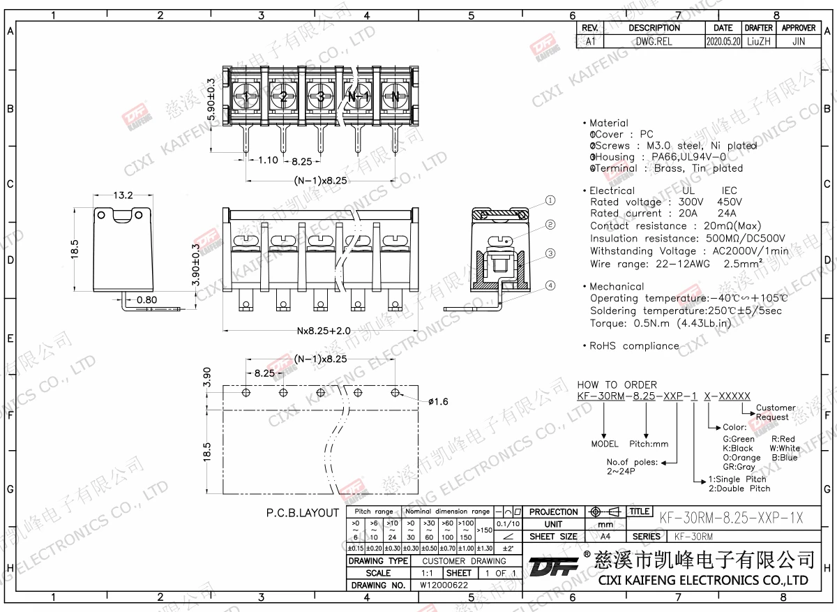 Material:M3.0 Steel,Ni platedTerminal:Brass,0.8t Ni platedHousing: PA66,UL94V-0ElectricalULIECRated voltage300V 450V Rated current20A24AInsulation resistance500MΩ/DC500VWithstanding voltage AC2000V/1minWire range22-12AWG 2.5mm²MechanlicalTemp.rang-40℃~+105℃ Torque0.5N.m 4.4Lb.in