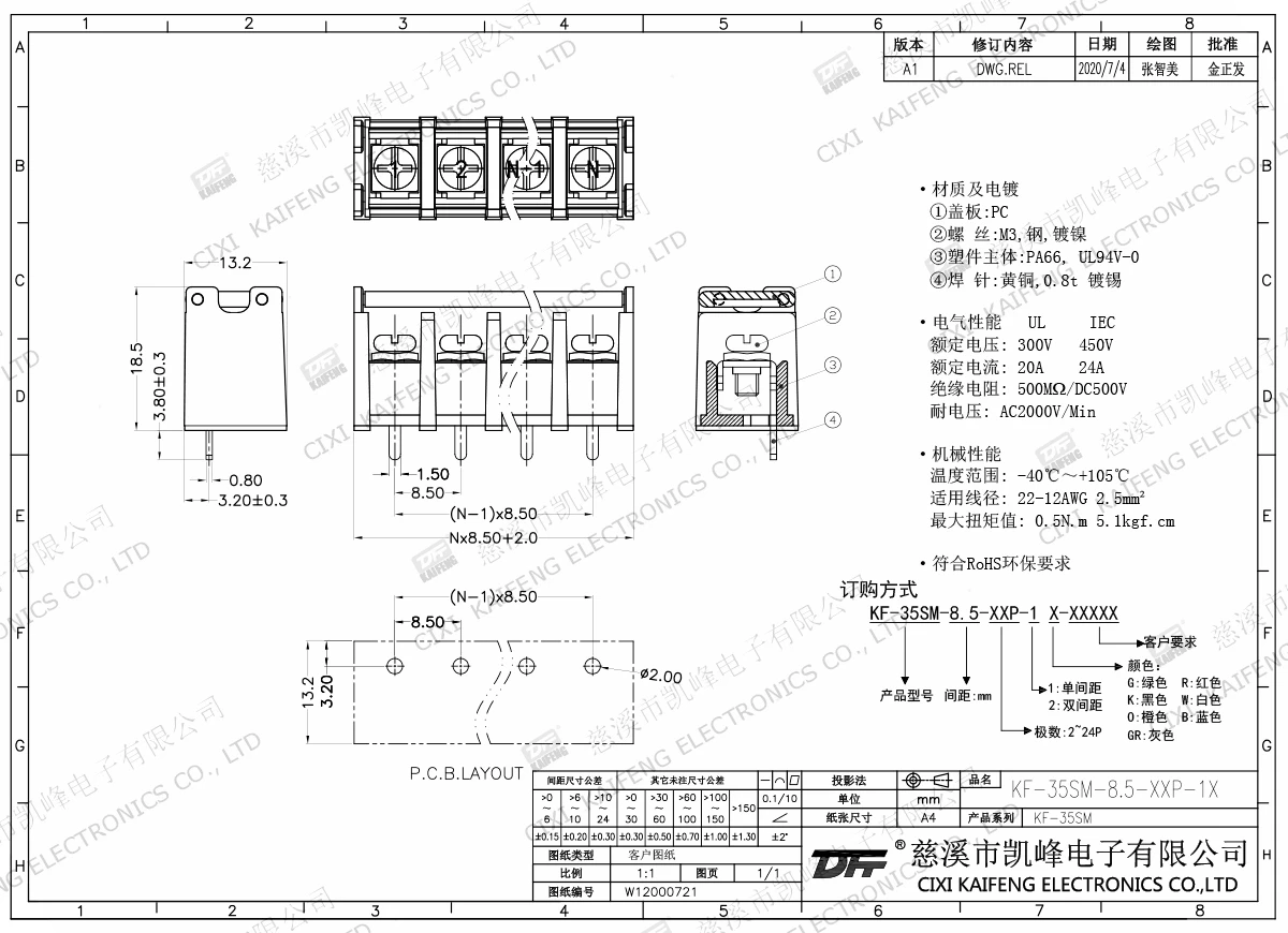 Material:M3.0 Steel,Ni platedTerminal:Brass,0.8t Ni platedHousing: PA66,UL94V-0ElectricalULIECRated voltage300V 450V Rated current20A24AInsulation resistance500MΩ/DC500VWithstanding voltage AC2000V/1minWire range22-12AWG 2.5mm²MechanlicalTemp.rang-40℃~+105℃ Torque0.5N.m 4.4Lb.in