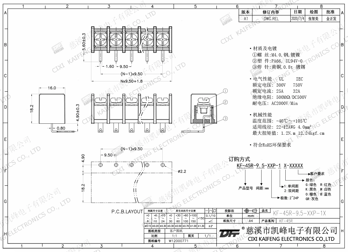 Material:M4.0 Steel,Ni platedTerminal:Brass,0.8t Ni platedHousing: PA66,UL94V-0ElectricalULIECRated voltage300V 750V Rated current25A32AInsulation resistance500MΩ/DC500VWithstanding voltage AC2000V/1minWire range22-12AWG 4.0mm²MechanlicalTemp.rang-40℃~+105℃ Torque1.2N.m 10.53Lb.in