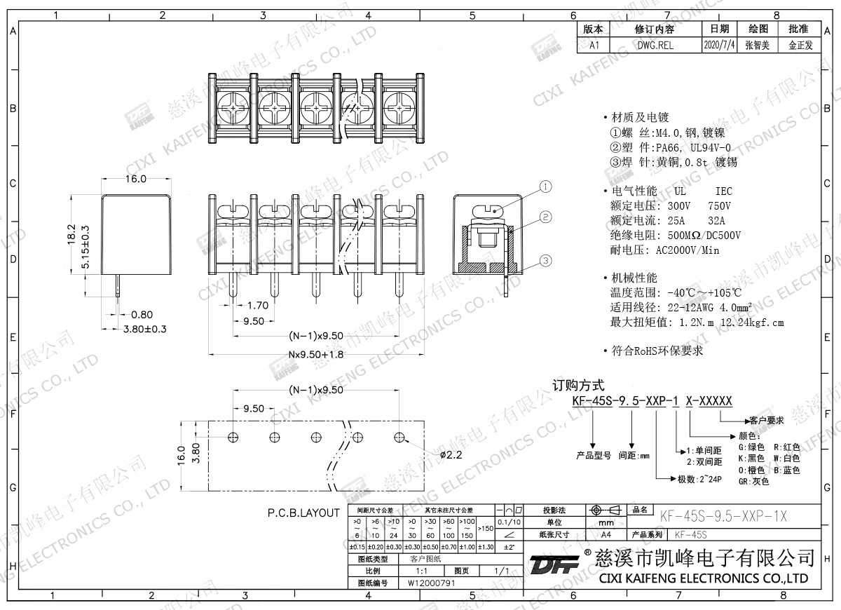 Material:M4.0 Steel,Ni platedTerminal:Brass,0.8t Ni platedHousing: PA66,UL94V-0ElectricalULIECRated voltage300V 750V Rated current25A32AInsulation resistance500MΩ/DC500VWithstanding voltage AC2000V/1minWire range22-12AWG 4.0mm²MechanlicalTemp.rang-40℃~+105℃ Torque1.2N.m 10.53Lb.in