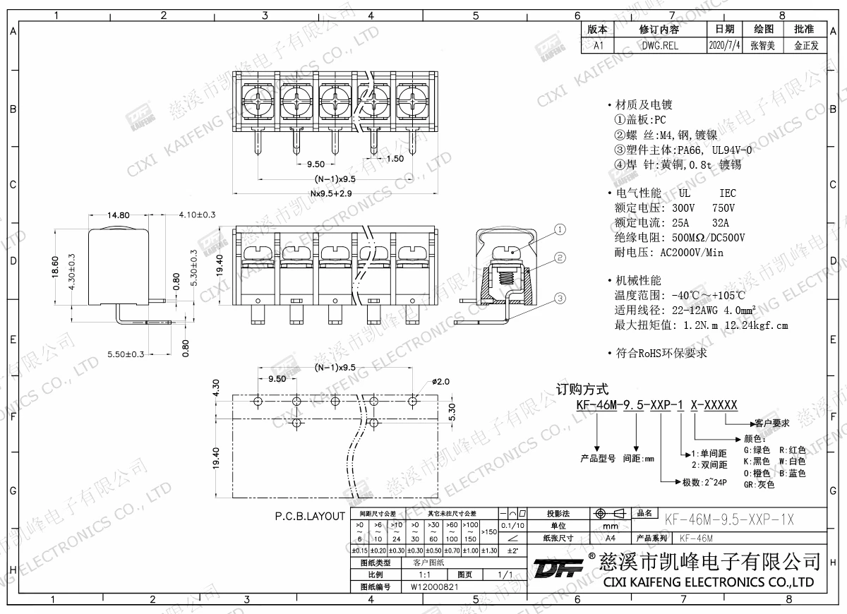 Material:M4.0Steel,Ni platedTerminal:Brass,0.8tNi platedHousing:PA66,UL94V-0ElectricalULIECRated voltage300V750VRated current25A32AInsulation resistance500MΩ/DC500VWithstanding voltage AC2000V/1minWire range22-12AWG4.0mm²MechanlicalTemp.rang-40℃~+105℃Torque1.2N.m10.53Lb.in