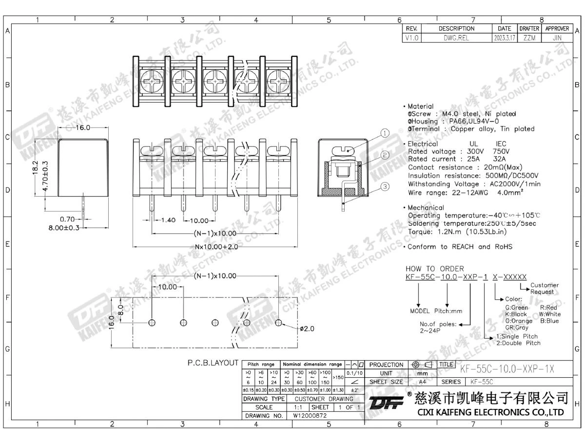 Material:M4.0 Steel,Ni platedTerminal:Brass,0.8t Ni platedHousing: PA66,UL94V-0ElectricalULIECRated voltage300V 750V Rated current25A32AInsulation resistance500MΩ/DC500VWithstanding voltage AC2000V/1minWire range22-12AWG 4.0mm²MechanlicalTemp.rang-40℃~+105℃ Torque1.2N.m 10.53Lb.in