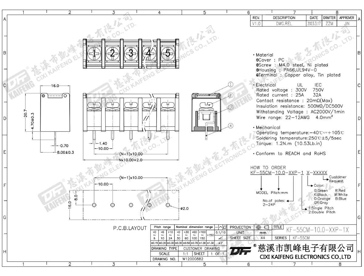 Material:M4.0 Steel,Ni platedTerminal:Brass,0.8t Ni platedHousing: PA66,UL94V-0ElectricalULIECRated voltage300V 750V Rated current25A32AInsulation resistance500MΩ/DC500VWithstanding voltage AC2000V/1minWire range22-12AWG 4.0mm²MechanlicalTemp.rang-40℃~+105℃ Torque1.2N.m 10.53Lb.in