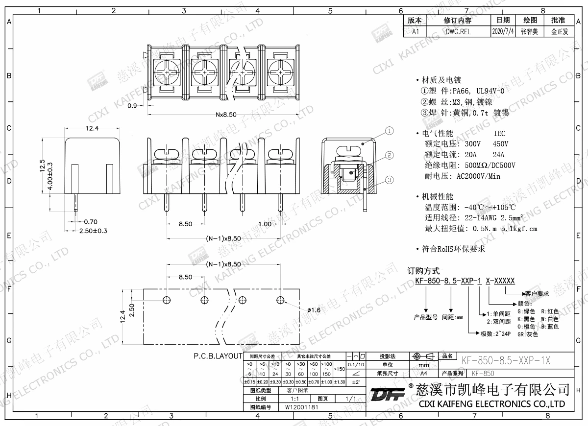 Material:M3.0 Steel,Ni platedTerminal:Brass,0.7t Ni platedHousing: PA66,UL94V-0ElectricalULIECRated voltage300V 450V Rated current20A24AInsulation resistance500MΩ/DC500VWithstanding voltage AC2000V/1minWire range22-14AWG 2.5mm²MechanlicalTemp.rang-40℃~+105℃ Torque0.5N.m 4.4Lb.in