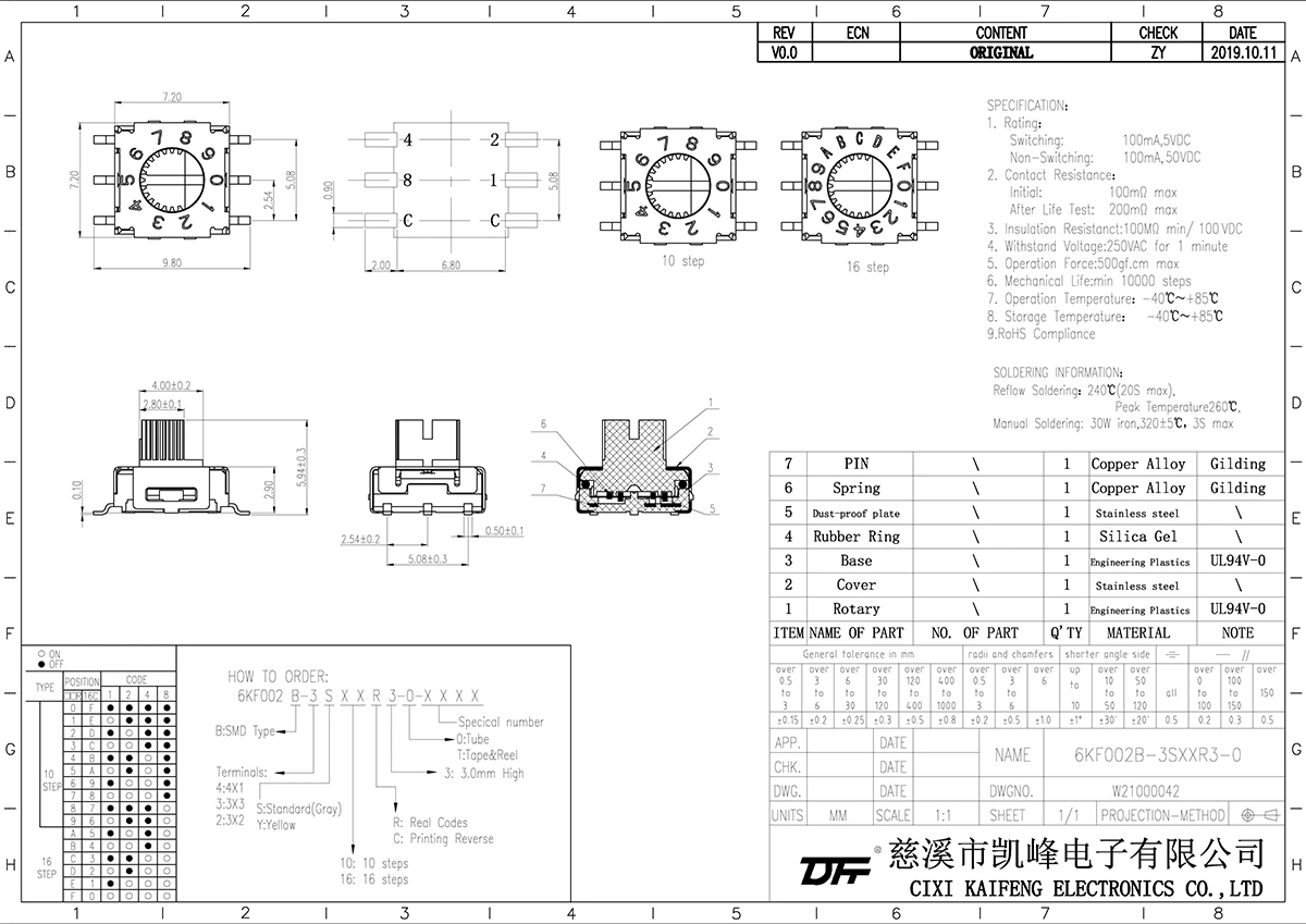 Rotary Switch Material:SPECIFICATIONRATINGSwitching25mA,24VDC Non-Switching100mA,50VDC Contact ResistanceInitial50mΩmaxAfter Life Test100mΩInsulation Resistance100MΩ min/250 VDCWithstand Voltage250VAC