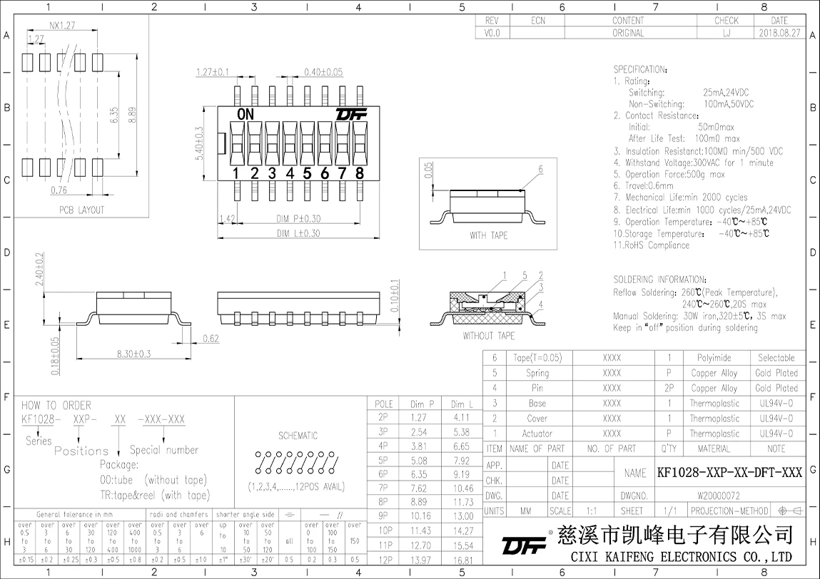 Dip Switch Material:SPECIFICATIONSRatingSwitching25mA,24VDCNon-Switching100mA,50VDCContact ResistanceInitial50mΩ/MaxAfter Life Test100mΩ/MaxInsulation Resistance100mΩ/Min.at 500VDCWiths